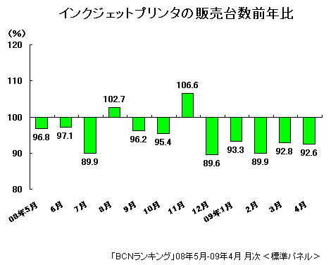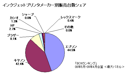 一方、「BCNランキング」でインクジェットプリンタ市場をみると、昨年、最大の需要期である12月の年末商戦で販売台数が前年を下回り、今年に入ってからも販売台数は前年割れが続いている。製造・物流コストの削減は急務で、こうした市場動向も背景にあるものとみられる。直近1年間(08年5月-09年4月)のインクジェットプリンタ販売台数シェアをみると、エプソンが44.5%、キヤノンが42.5%とほぼ互角。この両社が共通の目的で共同配送に取り組むという意義は大きい。