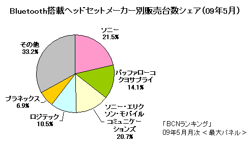 メーカー別の販売台数シェアもみておこう。1位はソニーで21.6%、2位はバッファローコクヨサプライで14.1%、3位はソニー・エリクソンで13.9%、次にロジテック10.5%、プラネックス6.9%と続く。