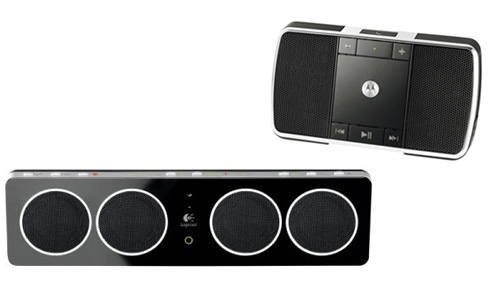 ハンズフリー通話にも対応するステレオスピーカー。ロジクール「PF-700」(左下)、モトローラ「EQ5」