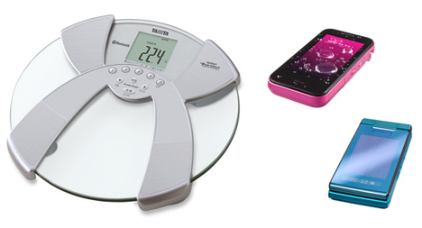 タニタの体組成計「BC-504」は、au「Sportio water beat」「SOLAR PHONE SH002」(右下)と連携して身体データを管理できる