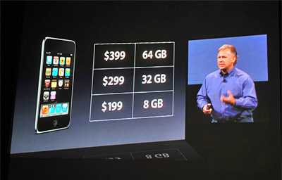 そして、シラー氏は返す刀でiPod touchの新ラインアップを発表。従来からの8/32GBモデルに64GBモデルを追加するとともに、価格改定も発表した。日本での価格は8GBモデルが1万9800円、32GBモデルが2万9800円、64GBモデルが3万9800円。また、32/64GBモデルでは、新型エンジンの搭載でゲームなどの起動が50%高速化しているという。