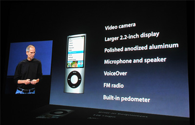 「一般的なビデオカメラは4GBで149ドルといったところだが、我々の製品は8GBで無料だ。どういうことかというと――新しいiPod nanoにビデオを搭載するんだ」と説明し、新型iPod nanoを紹介した。
