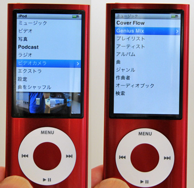 新iPod nanoのメニュー画面。ビデオカメラやGenius Mixの文字が確認できる