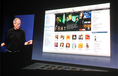 続いてジョブズ氏は「さあ、音楽の話をしよう。皆が大好きなiTunesの話だ」と切り出し、いまや23か国で1億アカウントのユーザーに向けて展開する「iTunes Store」が世界でナンバー1の音楽小売ストアになったと告げた。