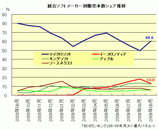 ワープロや表計算ソフトなど、主に仕事や勉強で使用頻度の高いソフトをまとめた、いわゆるオフィス製品は、マイクロソフトのMS-Officeが事実上の標準。「BCNランキング」でオフィス製品にあたる「統合ソフト」のメーカー別販売本数シェアを集計すると、マイクロソフトが50-80%を占めている。その寡占市場で、このところ勢いがあるのが互換ソフトメーカーだ。中でも「EIOffice」を販売するイーフロンティアは、09年4月にメーカー別販売本数シェアで8.6%を獲得し2位に浮上。以来、9月までマイクロソフトに次いで、統合ソフトで第2位のシェアを維持し続けている。