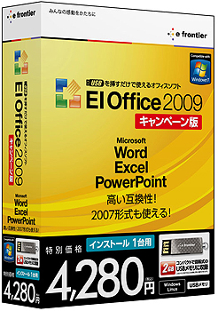 さらに、10月22日には特別価格のキャンペーン版を発売。「USBを挿すだけで使えるオフィスソフト EIOffice2009 +1PC キャンペーン版」を4280円、「USBを挿すだけで使えるオフィスソフト EIOffice2009 +3PC キャンペーン版」を7980円、「EIOffice2009 +1PC CD-ROM キャンペーン版」を3780円で販売し低価格路線をさらに推し進める。
