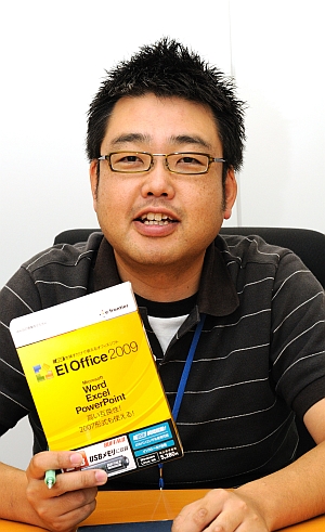 いわゆるオフィス互換ソフトのEIOfficeが好調だ。イーフロンティアが2月末に発売した「USBを挿すだけで使えるオフィスソフト EIOffice2009 +1PC」は、価格が5000円前後と安いことに加え、USBメモリで販売していることもうけて、オフィス製品でマイクロソフトに次ぐ販売本数シェアを半年間維持している。そこで、企画開発統括部・製品企画グループの佐藤健二氏に、好調の要因や戦略を聴いた。