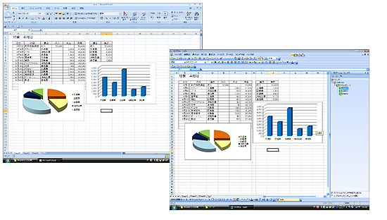 EIOfficeは互換性が高い。MS Office Excel 2007(左)とEIOffice2009 スプレッドシート