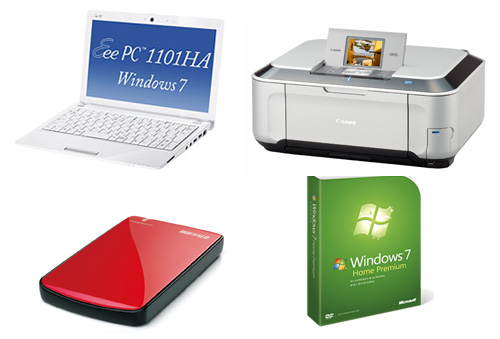 ASUSのネットブック「Eee PC 1101HA-WP」、キヤノンの複合プリンタ「MP990」、バッファローのSSD「SHD-PEシリーズ(ルビーレッド)」、マイクロソフトのOS「Windows 7 Home Premium」