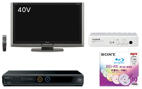 シャープの液晶テレビ「LC-40LX1」、マスプロ電工のデジタルチューナー「DT620」、シャープのBDレコーダー「BD-HDS43」、ソニーのBDメディア「10BNE1VBCS2」