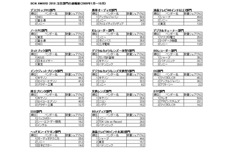 AV機器関連で新設したのはデジタルチューナーと、DVDメディアから分離したBDメディアの二つ。デジタルチューナーは、機能を限定した低価格モデルを各社が発売したことで普及が進んだ。現在の1位はマスプロ電工で25.9%、2位はI・Oデータ機器で18.9%。一方、BDメディアはソニーが1位で28.9%、2位はTDK Life on Recordで26.0%。09年は録画機能付きテレビのラインアップが豊富になり、2010年は記録メディアであるBD市場の成長も期待できそうだ。