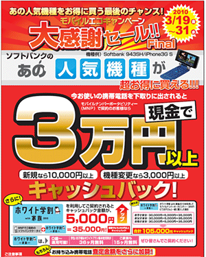 キャッシュバック金額は、番号ポータビリティが3万円、新規契約が1万円、機種変更が3000円。これに加え、下取りの携帯電話の代金をキャッシュバックする。下取りに出す携帯電話は、古いものや故障したものでも問題ない。さらに、「ホワイト学割 with 家族 2010」を利用すると、追加で5000円キャッシュバックする。