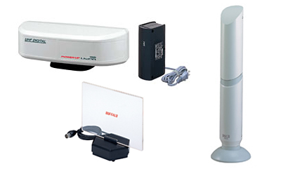 (左上から時計回りに、八木アンテナの「ブースタ内蔵ツインパネル型UHFアンテナ パワーアップUwPA」、全方向に感度がある無指向性タイプの同「セミサーキュラー型UHFアンテナ DUCA」、PCからUSBで給電できるバッファローの「ブースター内蔵 地デジ対応機器専用 室内アンテナ DT-OP-RA」)