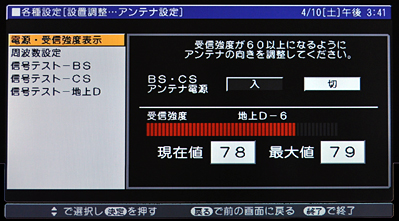 地デジの受信強度は、室内アンテナの62~80に対し、新たに設置されたアンテナは84以上(テレビは90以上)と、やはり開きがあった(ブースター不使用・晴天・雨戸オープン時)。とはいえ、推奨受信強度は60以上なので、室内アンテナでも実用には問題ない。しかし、悪天候だと受信レベルが40台まで落ち、映像にブロックノイズが混じることもあった。(受信強度の調査対象機器は、シャープの液晶テレビ・HDD内蔵DVDレコーダー、ソニーのBDレコーダーの3台。画面はHDD内蔵DVDレコーダーのもの)