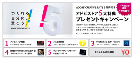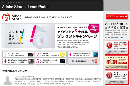 その一つが、サイトでの購入者を対象にしたキャンペーンだ。例えば、最新ソフト「Adobe Creative Suite 5(CS5)」では、サイトで商品の購入者を対象に「5大特典プレゼントキャンペーン」を行っている。