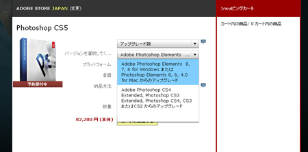 例えば、「Photoshop CS5」のサイトにアクセスしてアップグレード版を選択した場合、画面の真中にソフトのバージョンを選択する項目が現れる。ここをプルダウンすると、アップグレードが可能な製品を一覧表示する。自分が持っている製品がアップグレードできるかどうか、ひと目でわかるというわけだ。