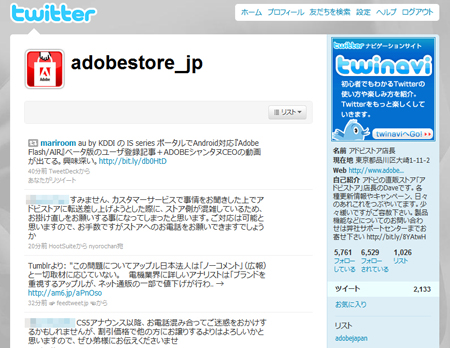 アドビ システムズ社は、直販サイトのサービスや使い勝手の充実を図る一方、「Twitter(ツイッター)」を使ってユーザーの声を聞く取り組みを始めている。ツイッター「アドビストア店長」で製品やサービス、サポートなどについてたずねることができる。「ツイッター経由でいただいた質問に対しては、できる限り回答していく。この場でやりとりを通じてユーザーの要望や意見をさらなるサービス向上に活かしていきたい」(田中部長)という。
