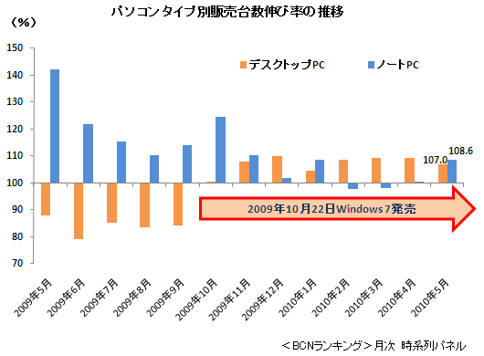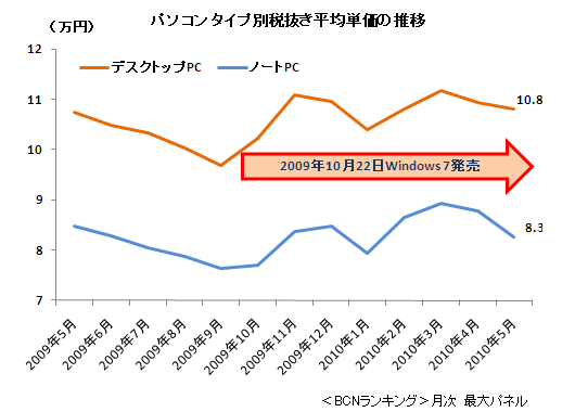 新OS発売当初は、先進的なユーザーが購入する傾向が強く、販売は一時的に上昇した後、落ち着くものだが、Windows 7の場合はその後も販売台数は好調。BCNランキングの販売台数推移をみると、概ね前年を上回って推移している。BCNの森英二アナリストによると、「2007年に登場したVista搭載機を買い控えたXPユーザーが、Windows 7搭載機を購入する動きが堅調。とくに、デスクトップや性能の高いノートパソコンなど、家庭内のメインマシンを買い替える人が動き始めている」という。Windows 7発売前までは、ビジネスマンの2台目や、家族用などで、5万円以下で買えるネットブックが人気を集めたが、Windows 7発売をきっかけに、メインマシンの買い替えに焦点を当て始めた人が増えてきたというわけだ。ネットブックは、CPU性能やメモリ容量のスペックが低いので、多くのソフトを入れたり大容量データを扱ったりすると、力不足に陥ってしまう。今使っているメインマシンのスペックに限界を感じたり、ネットブックに物足りなさを感じているなら、充実した機能を備える新しいパソコンを探すチャンスではないだろうか。