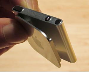 新型「iPod nano」は、クリックホイールがなくなったことで、前モデルに比べて46%小さくなった。幅40.9×高さ37.5mmと、ほぼ真四角。背面にはクリップが付いており、「iPod shuffle」のように服やカバンにつけて持ち運べる。
