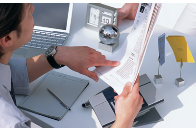 12時。ランチを胃に収めながら、手持ちの新聞と雑誌、主要なウェブサイトに目を通す。日々変化する経済情勢を把握するには、複数のメディアに触れておくことが大切だ。記事を読んでいてわからない言葉が出てきたら、セイコーインスツルの電子辞書「 SR-G6100NH」で調べる。このモデルは、NHK「ラジオ英会話」1年分の音声データとテキストを収録している。空き時間を使って英会話を勉強することができて便利だ。というわけで情報収集ランチは終了。残りの2社を回ろう。