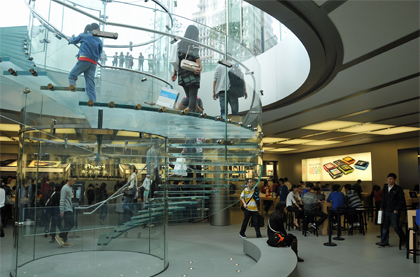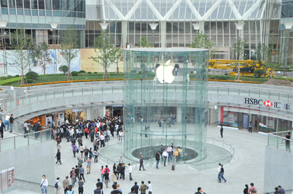 【上海発】今年7月に上海市・浦東にオープンしたアップルの直営店「Apple Store」。ロゴを大きく飾ったガラスシリンダーの入り口だけを地上に出し、店自体は完全に地下に構えるなどのユニークな建築が、上海市民や国内外の観光客の目を引いている。