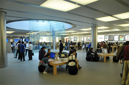 入り口を入ると、すぐ地下1階への階段。店は完全に地下になるので、窓などがなく、階段に設けた天井の穴から間接的に入ってくる光が唯一の自然光源だ。階段は店の中心にあり、周回にiPadやMacなど、各製品の売り場やタッチ&トライコーナーを設けている。