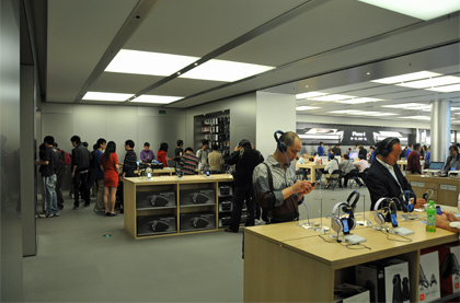 平日に訪れても、アップルストア上海は客で混みあい、店への出入りする人が後を絶たない。これまでなかった豊富な製品ラインアップや、店頭の特別な雰囲気が大人気のようだ。とくに客が集まるのは、iPhoneの最新機種「iPhone 4」やiPadの売り場のほか、ヘッドホン・イヤホンなどのアクセサリ売り場だ。
