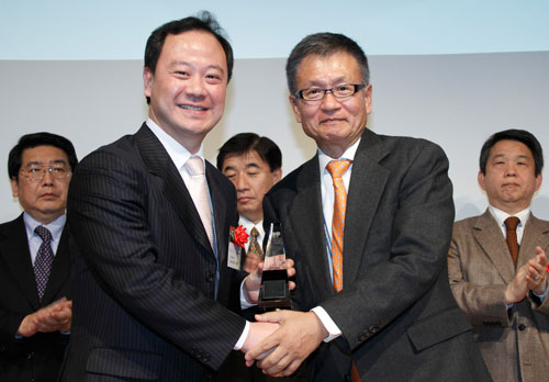 「BCN AWARD 2010」表彰式の様子(アスース・ジャパンのケビン・ドゥ社長と、BCNの奥田喜久男社長)