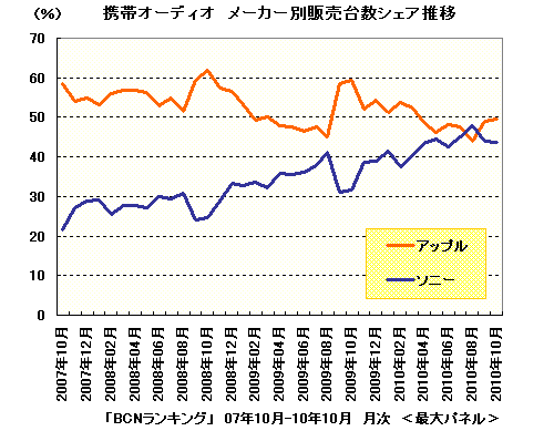 実際、ソニーの追い上げには勢いがある。直近3年間(07年10月-10年10月)の販売台数の推移をみると、07年10月はアップルが58.6%、ソニーが21.7%と、両社の間には36.9ポイントもの差があった。それが時間の経過とともにじわじわと縮まり、08年10月はアップルが61.9%でソニーが24.7%、09年10月はアップルが59.3%でソニーが31.7%、そして10年10月はアップルが49.6%でソニーは43.6%。ともに40%台が定位置となった。