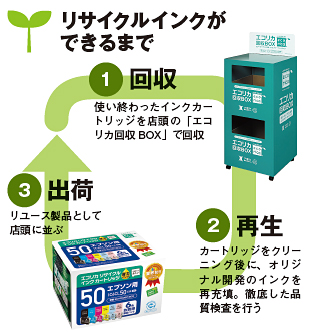 エコリカは、使い終わったインクカートリッジを全国に設置した「エコリカ回収BOX」で回収し、再利用(リユース)している。このリユースが環境保全に役立つと、日本環境協会から認定され、再生インクカートリッジでは初の「エコマーク」を取得。また、グリーン購入法の基準もクリアしている。ランニングコストを抑え、しかも高品質でエコにも配慮したエコリカのリサイクルインク。今年の年賀状印刷では、大いに活用してほしい。