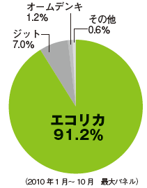 BCNランキングで、2010年1月~10月のリサイクルインクの販売数量メーカーシェアをみると、エコリカは91.2%と圧倒的。インクカートリッジ全体でも、8.5%と第3位に入る。