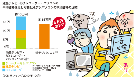 地デジテレビ、BDレコーダー、パソコンを別々に購入するよりも、地デジパソコン1台を買うほうが経済的。BCNランキングでみると、小型の液晶テレビとBDレコーダー、パソコンを別々に購入した場合、3つを合わせた平均単価は約18万円。一方、地デジパソコンなら平均単価は約14万円とお得だ。