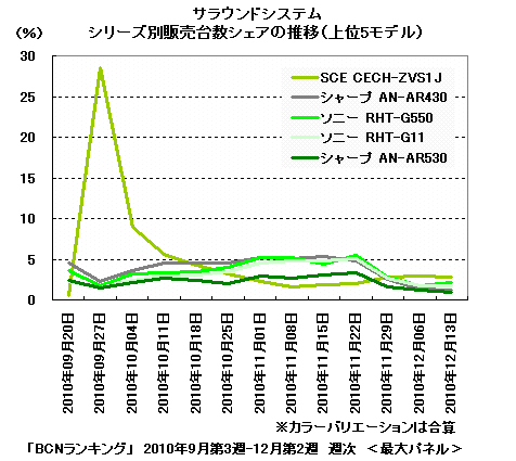 「CECH-ZVS1J」は、薄型テレビの手前に置く2.1chのバー型サラウンドシステム。「BCNランキング」で機種のカラーバリエーションを合算したシリーズ別の売れ筋をみると、発売直後の9月最終週(9月27日-10月3日)は、販売台数シェア28.5%という驚異的な数字で、1位を獲得。その後は落ち着いた動きになったが、12月第1週(12月6-12日)以降、再び1位に浮上した。