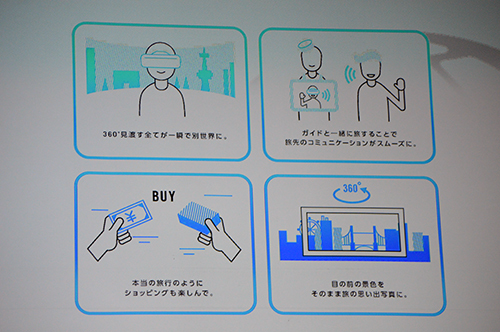 専用のVRゴーグルを装着すると、リアルタイムで海外の旅行先と接続。まるで本当に現地に来ているような360°映像でリアリティある体験を味わえる。特筆すべき点は、VRがつなぐ現地にはガイドがいて、相互にコミュニケーションがとれることだ。ガイドを仲介することで、自由に街を歩き回ったり、ショップで買い物をしたりすることができる。