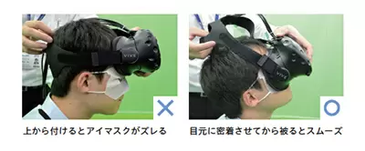 体験時は、衛生面の配慮からVRゴーグル用のアイマスクを着用するが、装着するには多少のコツがいる。上からスライドして付けるとマスクがズレてしまうので、まずはデバイスを目元に密着させてからバンドを頭に固定する。ドスパラでは、劣化や化粧の付着を防止するために購入後もアイマスクの装着を推奨している。