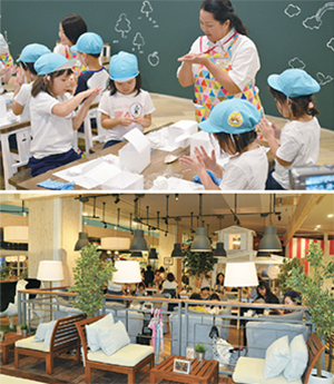子どもの創造意欲を刺激するワークショップを開催。すぐ近くにはオープンカフェがあり、母親はお茶を飲みながら、安心して子どもを預けることができる。