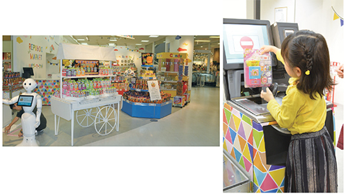 子どもにリアルな買物体験をさせる業界初の施設。セルフレジを設置し、金銭感覚やお金の知識を養いながら、ショッピングの楽しみを伝える。