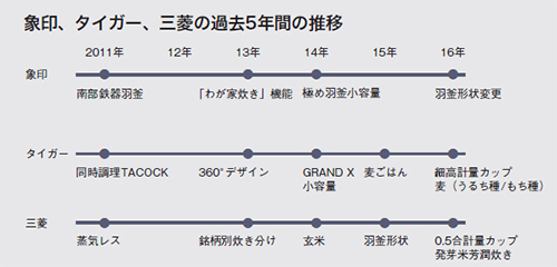その間、88年にはパナソニックが国内初のIH加熱式の炊飯器を発売したり、2006年に三菱が「本炭釜」を発売して10万円以上の高級炊飯器市場を創造したり、競合同士が技術や機能でしのぎを削ってきた。