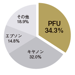 キヤノンとの激しいシェア争いを制したPFU。毎分20枚・40面のスピードで大量の書類をワンプッシュで取り込める使い勝手のよさをもつ「ScanSnap S1500」が“自炊派”からの支持を受け、終始市場をリードした。