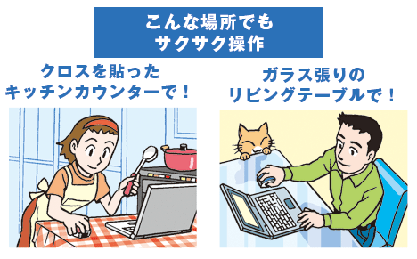 ノートPCをリビングのテーブルやキッチンなど、ふだん置いている机以外の場所で使うことは多い。モバイルPCなら、カフェのテーブルやベッドで使うこともある。置いた場所が布張りやガラス張りだと、マウスがうまく動作せず、ポインタが動かなかったり、カーソル飛びが起きたりする。マウスパッドがあれば防げるが、わざわざ持ち歩くのは面倒だ。