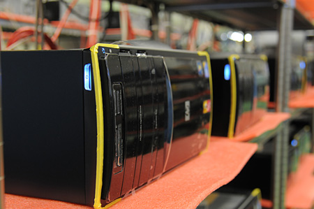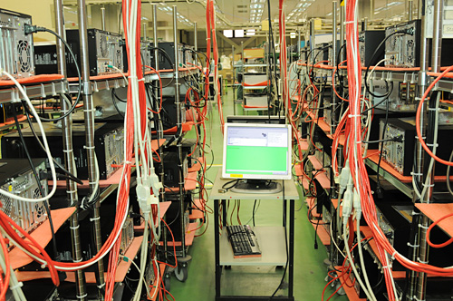 プリテストによって、ハードウェア構成に間違いがないことを確認すると、次はランイン(連続動作試験)へと移る。スチールラックに整然と並んだPC本体に、サーバーからのケーブルがつながれ、自動的に過負荷テストなどの連続動作試験が進められる。このランインは、人の手が一切介入しない。テストは、サーバーとPCのやりとりだけで進んでいく。