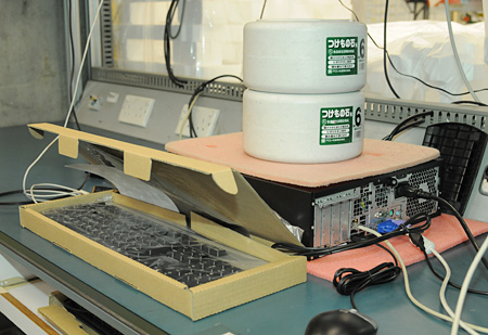 耐荷重テストでは、なんと6kgの漬け物石2個をPC本体に乗せる。荷重がかかった状態で、PC内部のパーツなどが正常に動作するかをチェックするのだ。かつて、本体に重いCRTモニタを乗せていたことから始まったテストだという。
