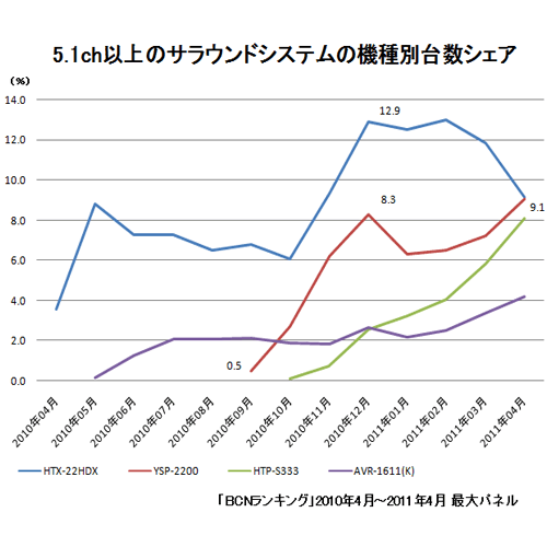 このバータイプのなかでとくに高い人気を誇っているのが、ヤマハのデジタル・サウンド・プロジェクター「YSP-2200」だ。2010年10月の発売以来、順調な売れ行きで、昨年の年末商戦では、BCNランキングの5.1chサラウンドシステムの機種別販売台数シェアで8.3%のシェアを獲得して一気にブレーク。今年4月には、9.1%まで伸ばしている。注目すべきは価格。バータイプの他社製品に比べると2倍程度の価格にも関わらず、売れているのだ。
