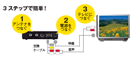 「アンテナをつなぐ」「電源をつなぐ」「テレビにつなぐ」のわずか3ステップで完了。導入が簡単なのもうれしい。テレビと接続するときの映像入力は、コンポジットビデオやS端子に加えて、D端子にも対応する。D3/D4入力対応のアナログテレビなら、デジタル放送の精細なハイビジョン映像が楽しめる。