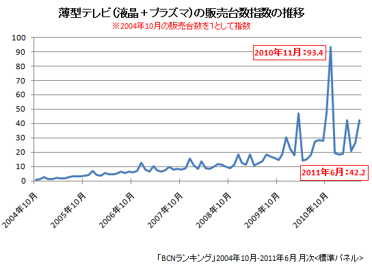 エコポイントが終了した今年3月の実績は、東日本大震災の影響で予想を下回ったものの、2台目のサブテレビとして小型モデルの販売が好調。タイムリミット間際の6月販売実績も42.2と数値を伸ばしている。