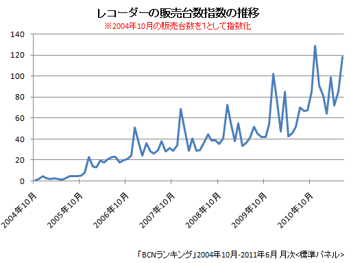 地デジチューナーを搭載したレコーダーについても、同様に2004年10月の販売台数を「1」として指数化した。レコーダーはテレビとセットで購入することが多いので、テレビの販売台数指数とほぼ同じ動きを示している。最近ではブルーレイディスク(BD)レコーダーの価格も手頃になり、地デジ化の必須アイテムとして販売を伸ばしている。「テレビは地デジ化したけれど、録画はまだアナログのまま」という人は、購入を検討していい時期だ。