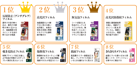 明るい場所での映り込みを軽減して画面を見やすくする「反射防止フィルム」、液晶画面を鮮やかに見せる「高光沢フィルム」、貼るときに気泡が入りにくい「無気泡フィルム」など、8タイプを用意。さらに、店頭で選びやすいようパッケージを色分けしている。豊富なラインアップもテレホンリースの強みだ。あなたにピッタリの一枚がきっと見つかるはずだ。