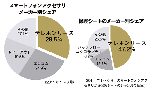 スマートフォンアクセサリ部門は、テレホンリース、エレコム、レイ・アウトの3社が全体の7割を占める。そのなかで、テレホンリースは28.5%のシェアを獲得し、上半期No.1に輝いた。さらに「保護シート」に絞れば47.2%と、市場の半分近いシェアを獲得した。