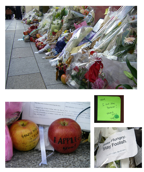 そんななかでの突然の訃報。アップルファンも深い悲しみに暮れた。10月6日から、アップルストア銀座店の店頭には多くのファンが訪れ、花を手向けた。献花台は設けられていないが、入り口の脇には花やアップルのロゴマークであるリンゴ、ジョブズ氏の写真、メッセージなどが置かれ、多くの人がジョブズ氏の死を悼んでいる。