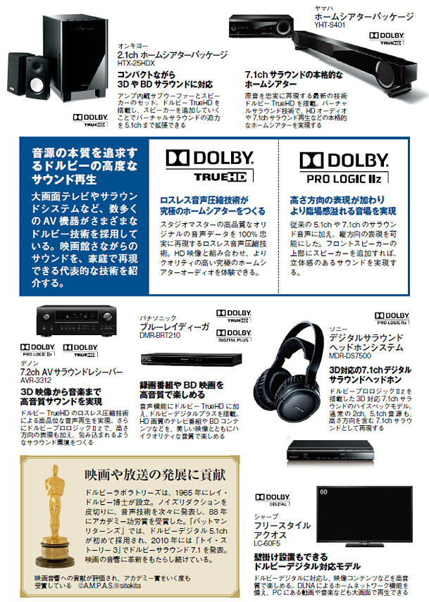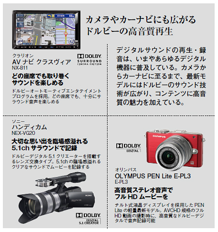 そんなドルビーの上質なサウンドは、映画館だけにとどまらず、家庭のAV機器やカメラ、ゲーム機にまで広がっている。最新のドルビー技術を搭載したデジタル機器なら、鮮やかで臨場感ある音声を手軽に耳にとどけてくれる。また、PCやモバイル端末でも、音質にこだわり、本格的なサウンドを楽しめる技術を提供している。ここでは、売り場に並ぶ新製品から、ドルビー技術を搭載したモデルをピックアップした。